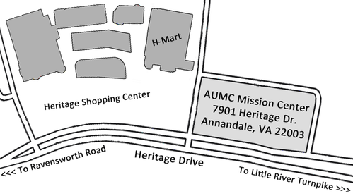 The Heritage Drive campus primarily hosts mission activities such as a weekly food distribution and community garden. It is next to the Heritage Shopping Center, closer to the side with the H-Mart. Heritage Drive is just off Little River Turnpike, near the 495 beltway exit.